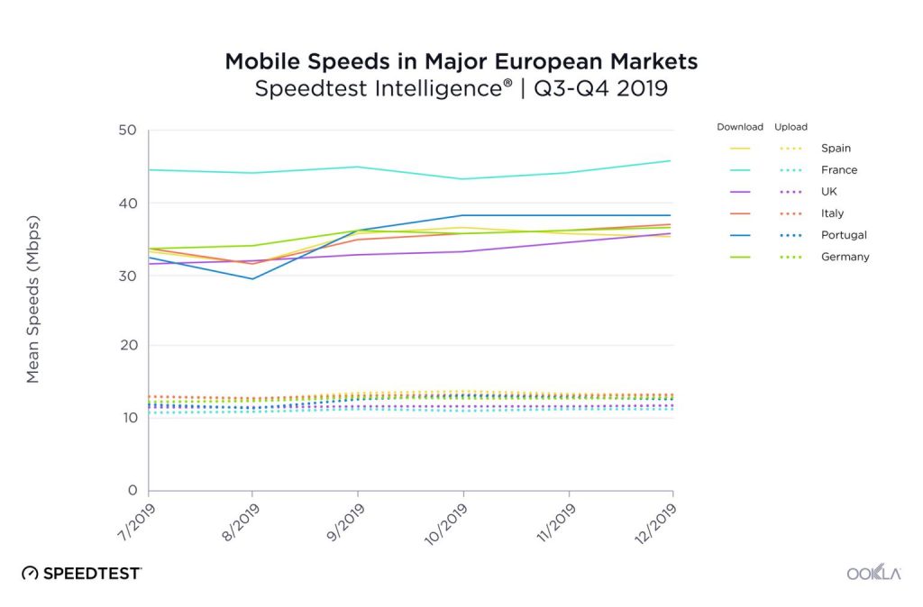– Spain showed the fastest mean upload speeds on mobile at 13.12 Mbps during Q3-Q4 2019.