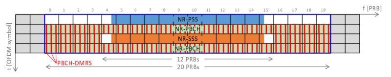 – The horizontal separations are the OFDM symbols, 4 OFDM symbols together with 20 RBs form a so-called “SS/PBCH (Synchronization Signals/ Physical Broadcast Channel) block”.
