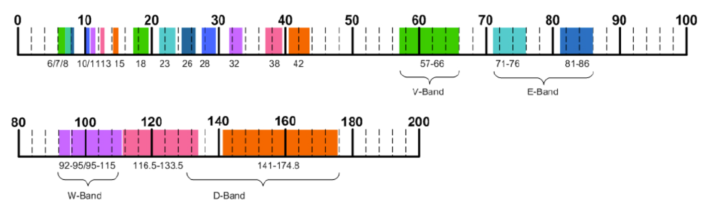 - Urban Areas: required bandwidth is a key challenge as for TDD-band deployment requires a bandwidth between 50-200 Gbps, calling for D-Band. D-band refers to the frequency range from 130 to 175 GHz.