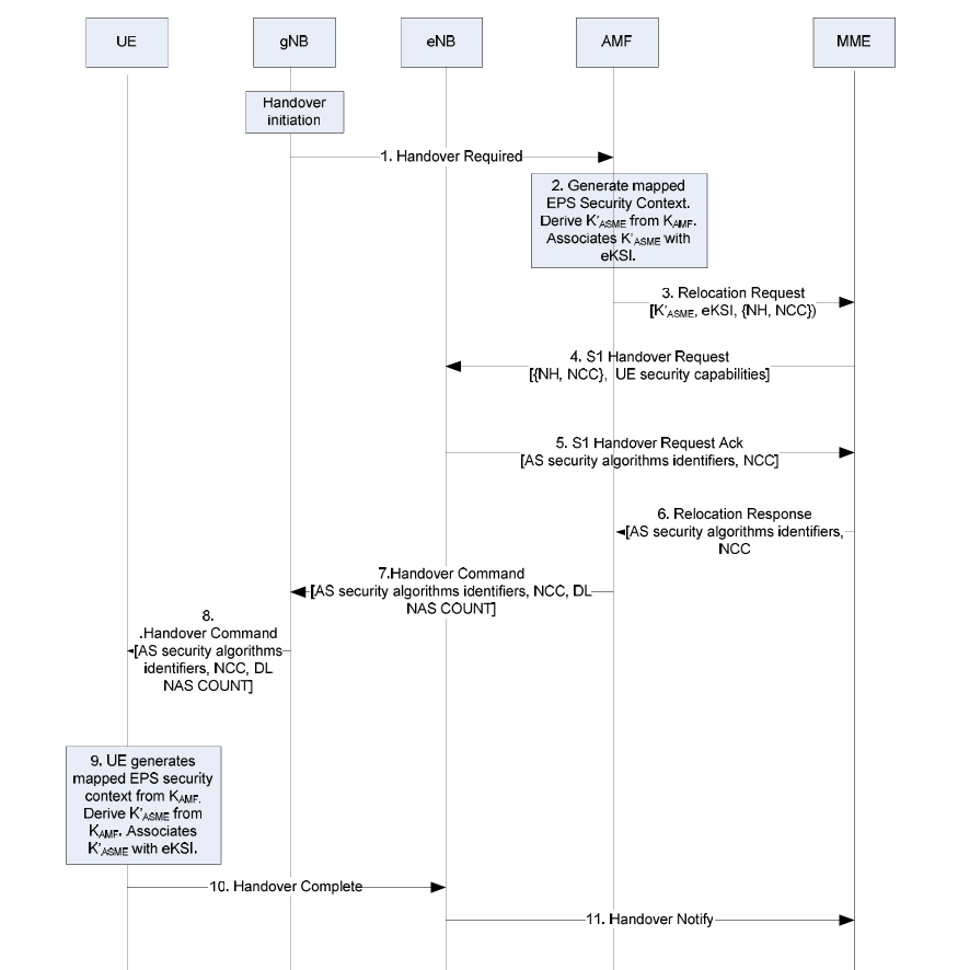 - Handover from EPS to 5GS starts with the source eNB sending a Handover Required message to the source MME, which forwards the EPS security context to the target AMF.