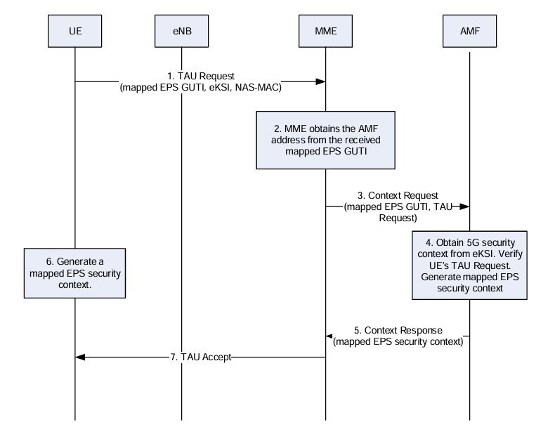 - The UE derives the mapped EPS NAS security context and activates it to process the TAU Accept message.