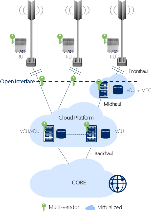 - RU separated and distributed vDU, vCU separated – typically vDU can be deployed jointly with edge computing resources depending on operator preferences;