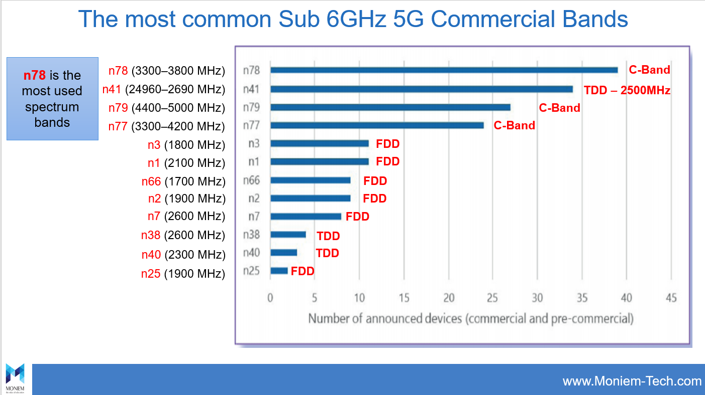 For the sub 6GHz band, the most commonly used frequency in this range as per GSA as below, I added the details of each frequency range in terms of transmission mode FDD or TDD.