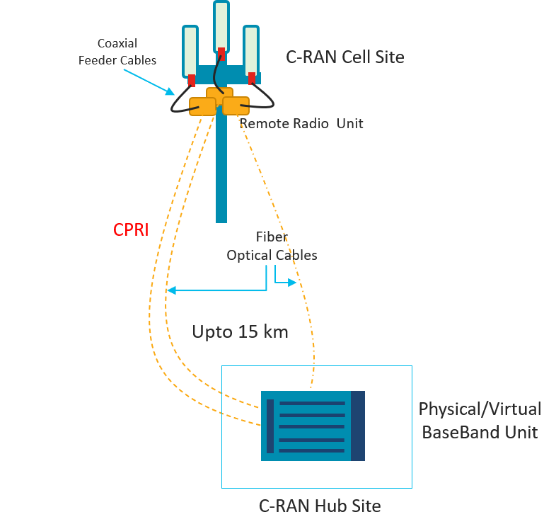 CPRI is an open specification for an interface between Radio Equipment Controllers (REC) often referred to as BBU, and Radio Equipment (RE), often referred to as RRH. The use of a CPRI interface run over a single-mode or multi-mode fiber enables the radio equipment to be mounted at the top of a tower very close to the antennas. The BBU and RRH can be up to 2 km apart using single-mode fiber or up to 25 km in a C-RAN network, facilitating the use of BBU hotels. The latest specification version 7.0 supports up to 24 Gbps line rates.