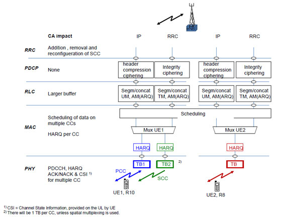In CA implementation, user traffic is split between carriers in the MAC layer.