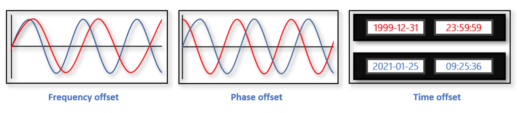 Not only the same number of repeated events per second (Frequency) must be maintained, but also the exact point within a single frequency cycle, meaning the time difference between two events (Phase) and actual date and time the event occurs (ToD) is required.