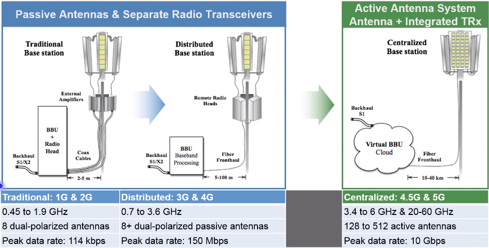 Towards to 4.5G and 5G, Introducing Active Antenna System (AAS) [ Radio Unit + Antenna System ] and centralized BBU that can be located in a remote DC (Data Center) and this is called C-RAN or Centralized RAN, this will reduce the CAPEX, less power consumption and a fast deployment roll-out.